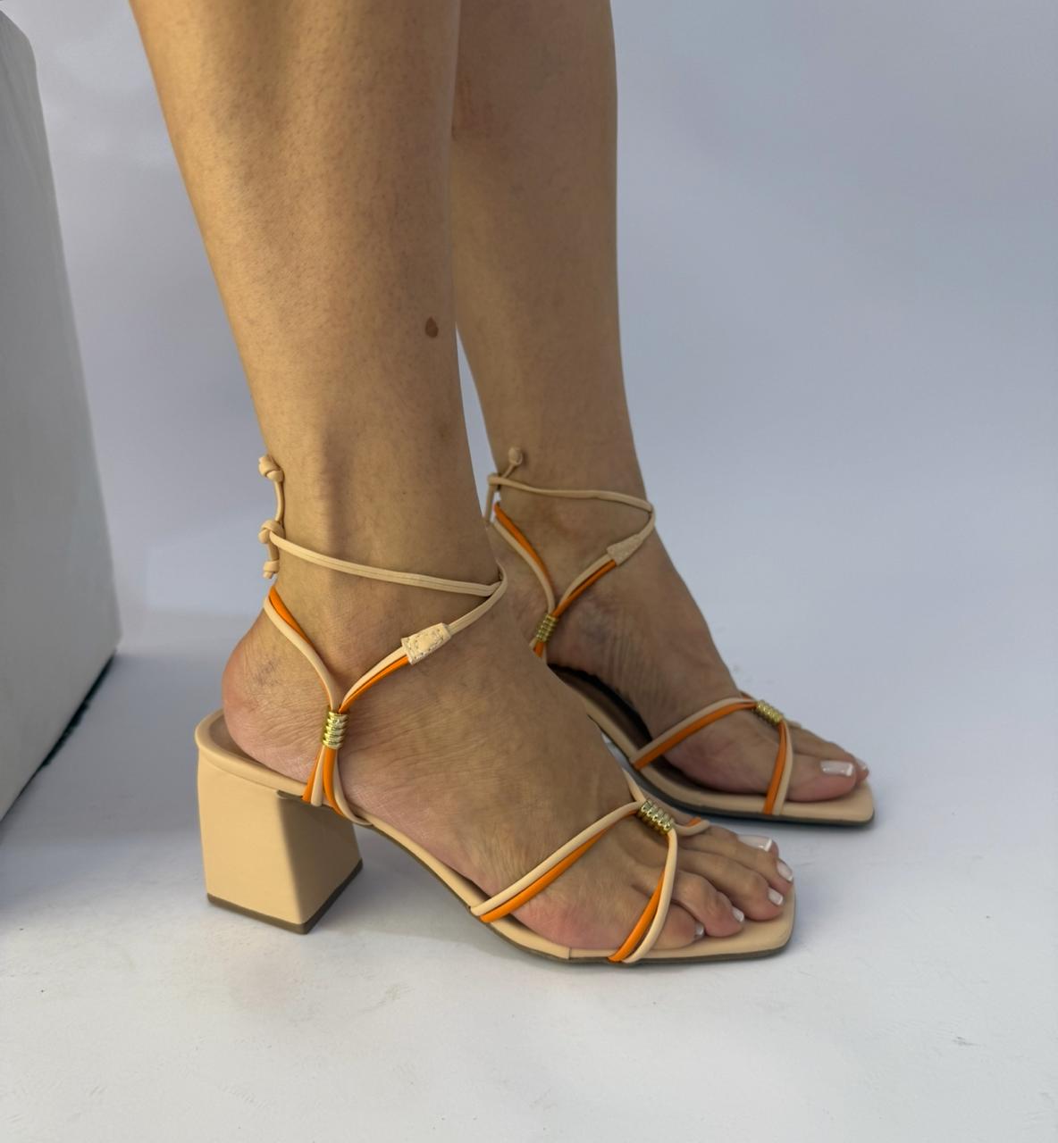 Suas tiras combinam as cores bege/ nude e coral dando autenticidade para a sandália. Com elas é possível fazer diversas amarrações.
